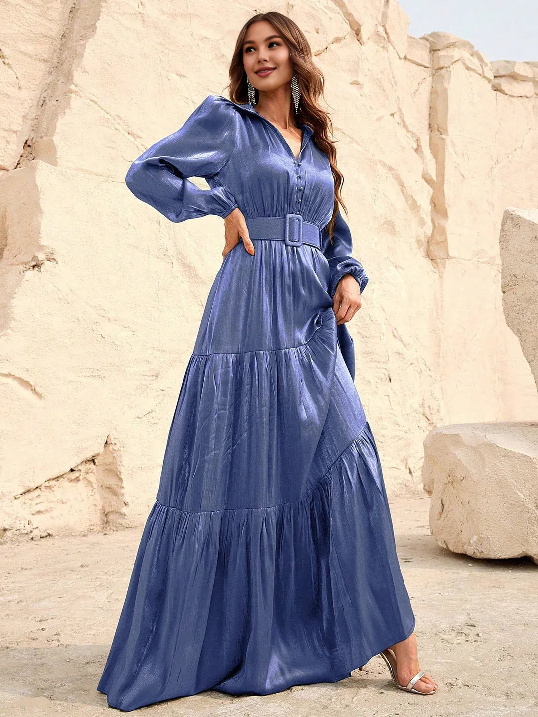 weitese's Elevate your sophisticated allure with this olive green satin tiered maxi dress. It features lustrous satin fabric with a shirt collar and button-front detailing for opulent allure, a tiered skirt with voluminous layers for refined charm, and a belted waist with puff sleeves for sophisticated flair. The versatile olive green hue ensures a timeless finish, making it perfect for formal events, evening gatherings, or any occasion where you want to blend classic tailoring with modern, textural design.