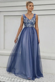 weitese's elegant navy gown features a V-neckline, sleeveless lace bodice, and a flowing ombre tulle skirt for soft dimension. The intricate lace detailing adds sophistication, while the A-line silhouette balances grace and versatility—ideal for weddings, bridal parties, or upscale evening events.
