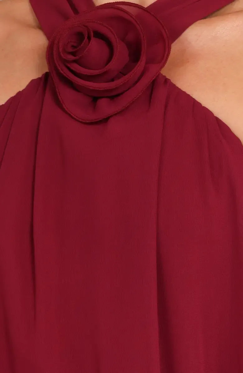 weitese's Elevate your romantic allure with this burgundy chiffon halter neck maxi dress. It features a lightweight chiffon fabric with a chic halter neckline adorned with a floral accent for elegant charm, a flowing silhouette that ensures graceful movement, and a tailored fit that exudes timeless sophistication. The rich burgundy hue and refined construction make it perfect for formal events, garden weddings, or any occasion where you want to embrace feminine, show-stopping glamour.