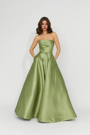 weitese's Step into elegance with this olive green satin strapless ball gown: featuring a structured bodice, voluminous A-line skirt, and convenient side pockets. The lace-up back adds a touch of detail while ensuring a perfect fit. Luxe satin fabric gives a rich sheen—ideal for proms, weddings, or formal galas, blending comfort and sophistication.