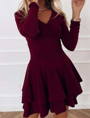 A-Line Cocktail Dresses Red Green Dress Wedding Guest Homecoming Short / Mini Long Sleeve V Neck Spandex with Pleats Pure Color