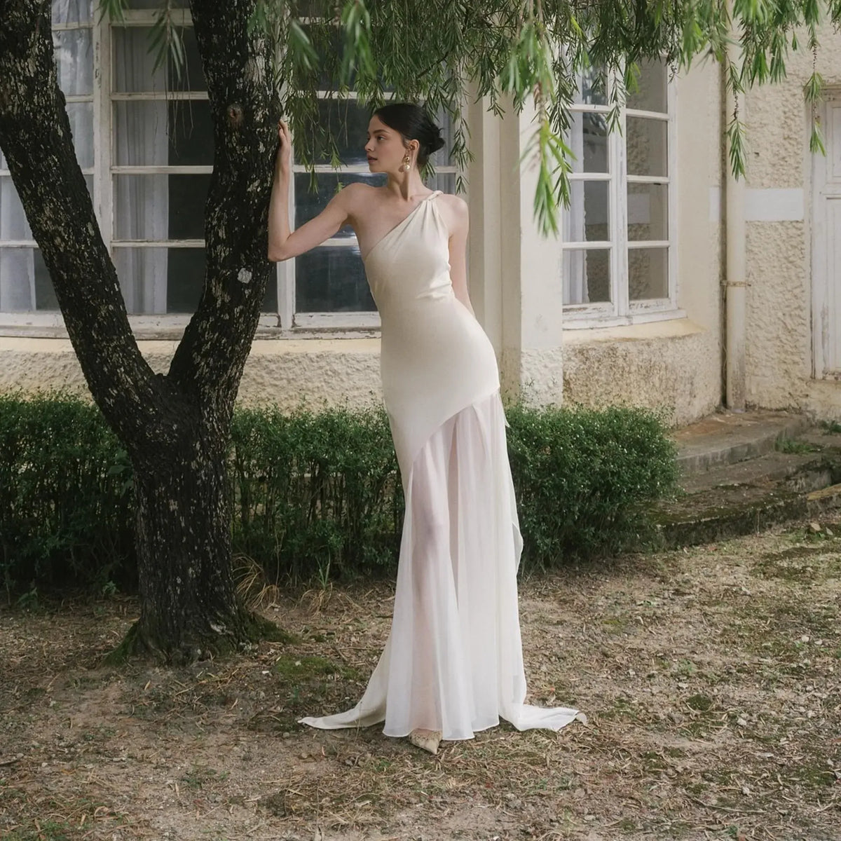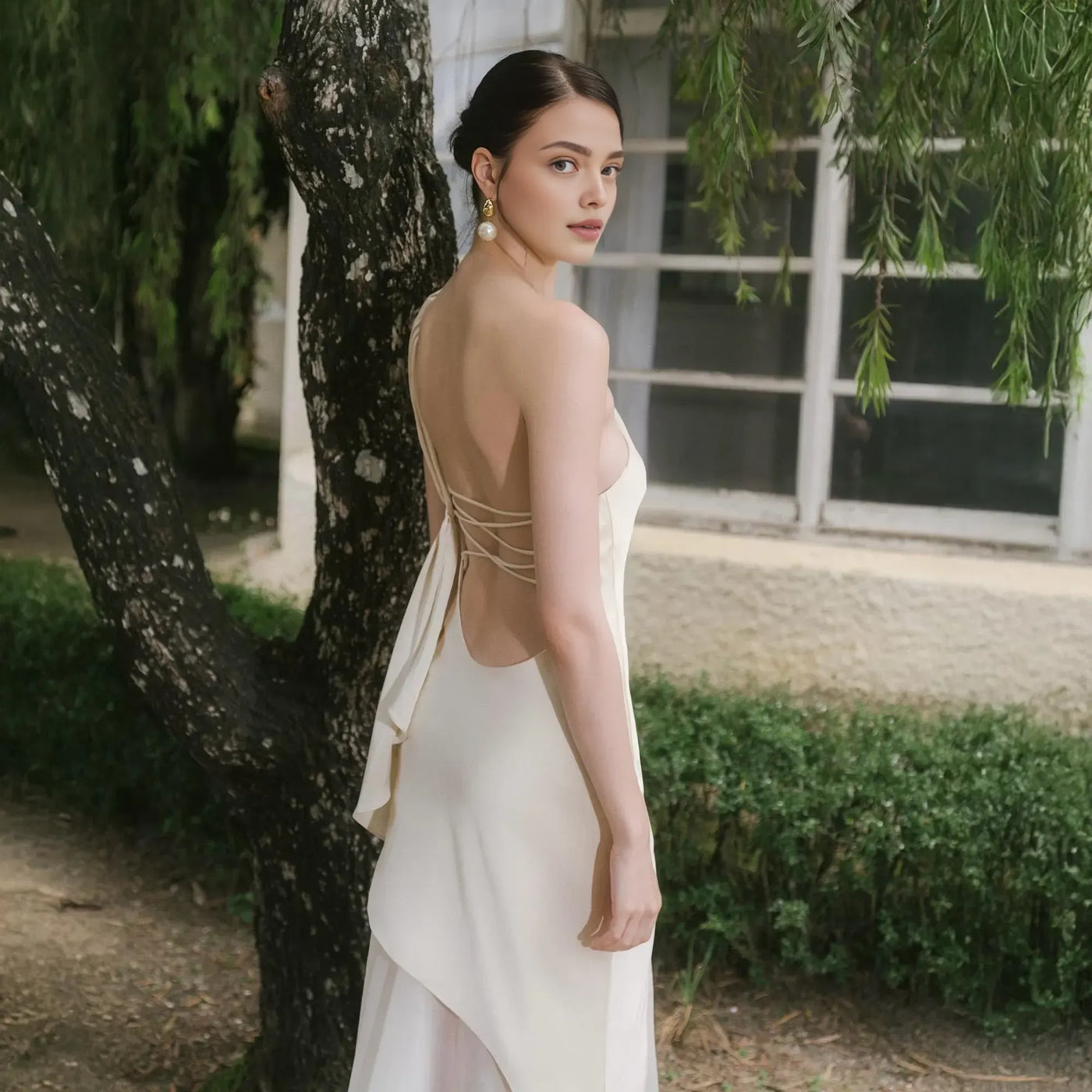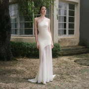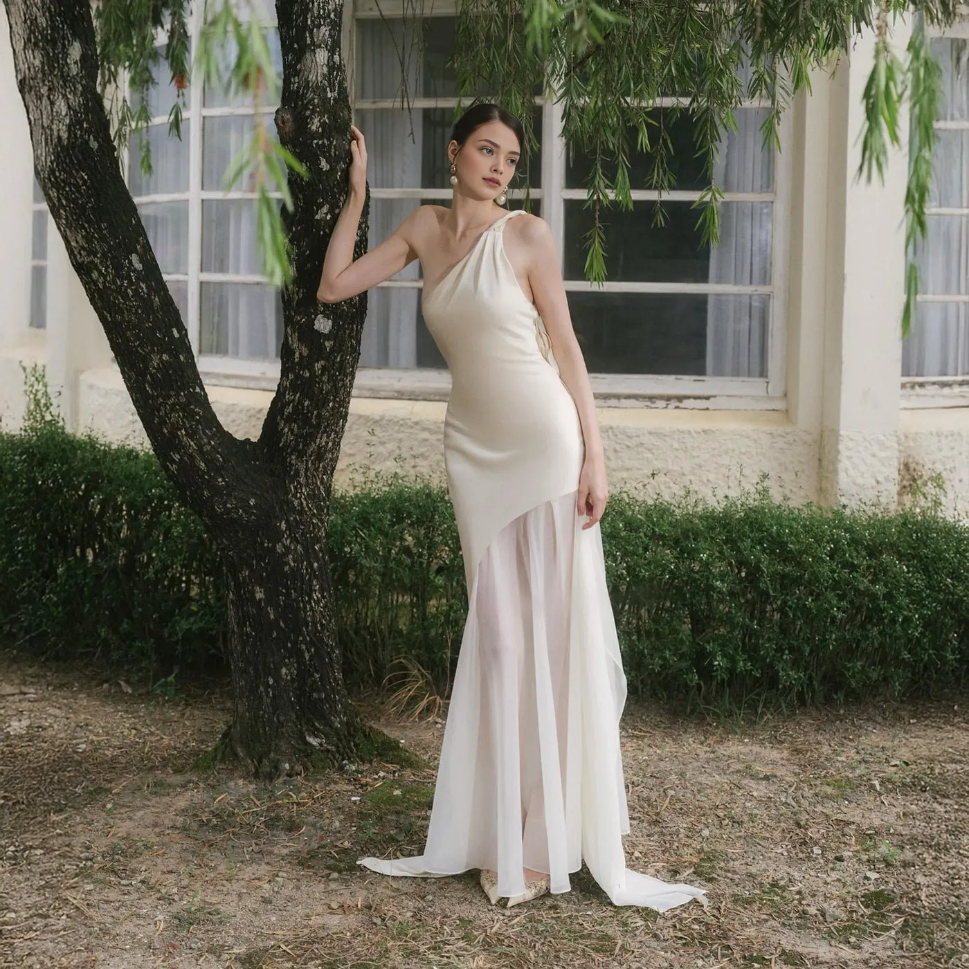 weitese's satin floor-length gown features a sleek one-shoulder neckline, open crisscross back, and sheer side slit. The minimalist silhouette balances contemporary elegance with subtle allure, making it ideal for elopements, intimate weddings, or upscale evening events—combines soft neutral tone with refined, modern design.