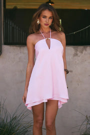 weitese's blush pink mini dress features a halter-neck design (with tie detail), strapless bodice, and an asymmetrical hem. The smooth fabric balances soft sophistication with modern minimalism, making it ideal for upscale brunch events, rooftop gatherings, or summer cocktail parties—combines delicate pastel tone with sleek, refined design.