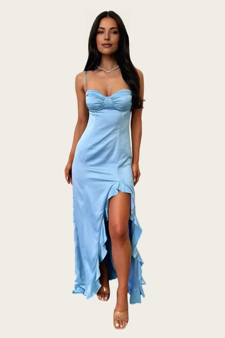 weitese's chic pale yellow gown features spaghetti straps, a sweetheart neckline, a form-fitting satin silhouette, and a high thigh slit (paired with ruffled detailing at the hem). The lustrous fabric and modern cut balance softness with sophistication—ideal for cocktail parties, summer weddings, or upscale daytime events. Its bright hue and sleek design create a fresh, alluring look.