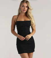 weitese's glitter sheath dress features a sleek column silhouette with a halter neckline, offering a modern and elegant look. Its sleeveless, backless design adds a bold touch, perfect for making a statement at homecoming. The short-mini length enhances its youthful appeal, while the sparkling fabric ensures you stand out in any crowd. Ideal for those seeking a confident and stylish outfit for special occasions.
