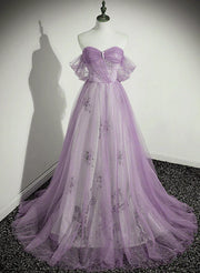 Lavender Tulle A-line Beaded Off Shoulder Party Dress