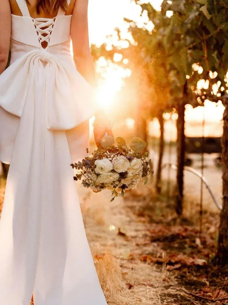 weitese's white mini gown features a structured square neck bodice, wide spaghetti straps, a sleek fitted silhouette, and a dramatic oversized bow (with a trailing fabric detail) at the back. The crisp, matte fabric and bold design balance contemporary chic with playful elegance, making it ideal for engagement parties, bridal showers, or upscale cocktail events—combines minimalist tailoring with eye-catching, modern allure.
