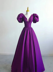 Purple Satin A-line Short Sleeves Long Formal Dress