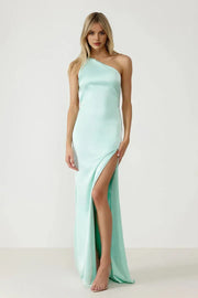 weitese's Elevate your formal style with this mint green one-shoulder satin maxi dress. It features a chic one-shoulder neckline, a high slit that adds movement and allure, and an open back with ruched detailing that enhances the silhouette. Crafted from luxurious satin fabric, this dress exudes timeless elegance and is perfect for galas, weddings, or any upscale occasion. The refreshing mint green hue and sophisticated design make it a standout choice, ideal for pairing with silver jewelry and strappy heels to complete a refined ensemble.