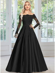 Weitese A-Line Evening Gown Floral Dress Formal Wedding Guest Court Train Long Sleeve Off Shoulder Satin with Appliques - US 2 / UK 6 / EU 32