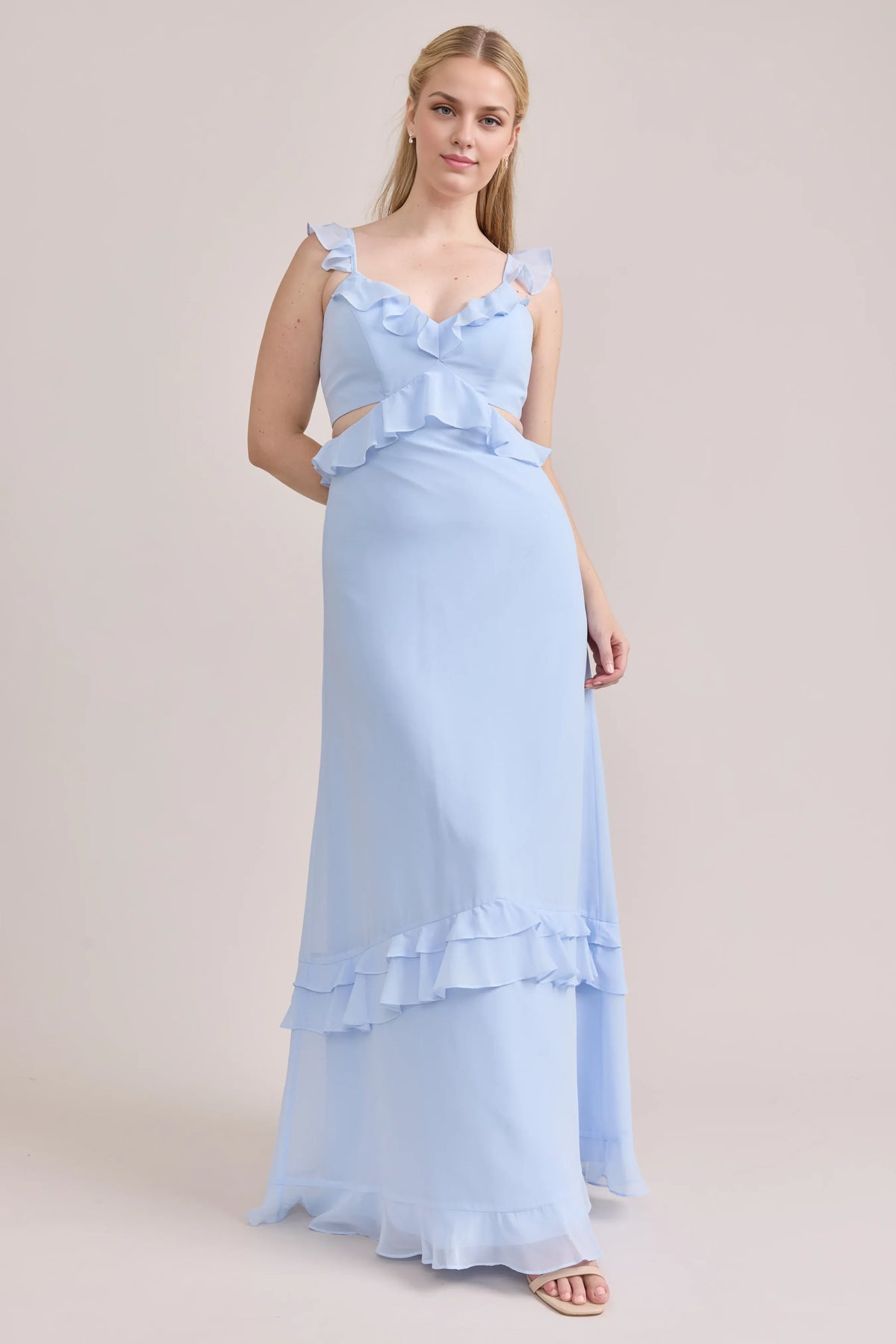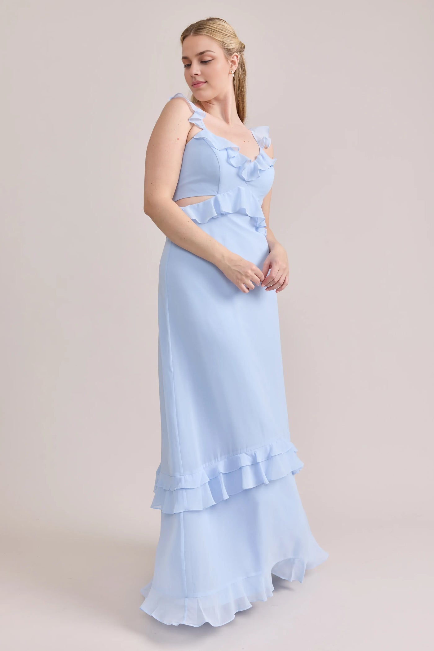 weitese's Elevate your bridal party look with this light blue bridesmaid dress. It features ruffled detailing on the neckline and straps for romantic charm, cutout accents for modern flair, and a tiered skirt with ruffled layers for playful movement. The lace-up back ensures a customizable fit, while the flowing fabric guarantees comfort and a flattering silhouette. Perfect for weddings, formal events, or any occasion where your bridesmaids want to showcase timeless sophistication with a touch of whimsy.
