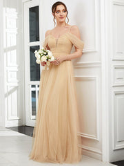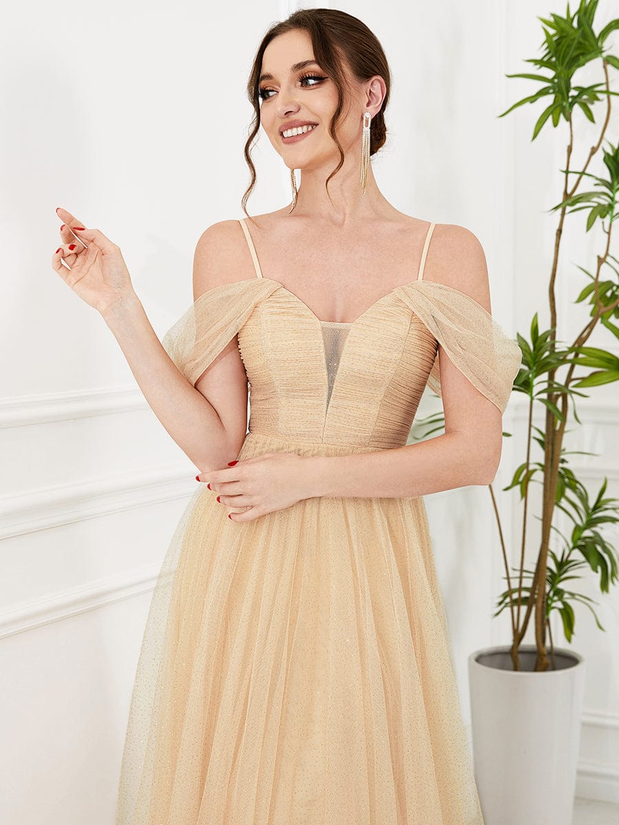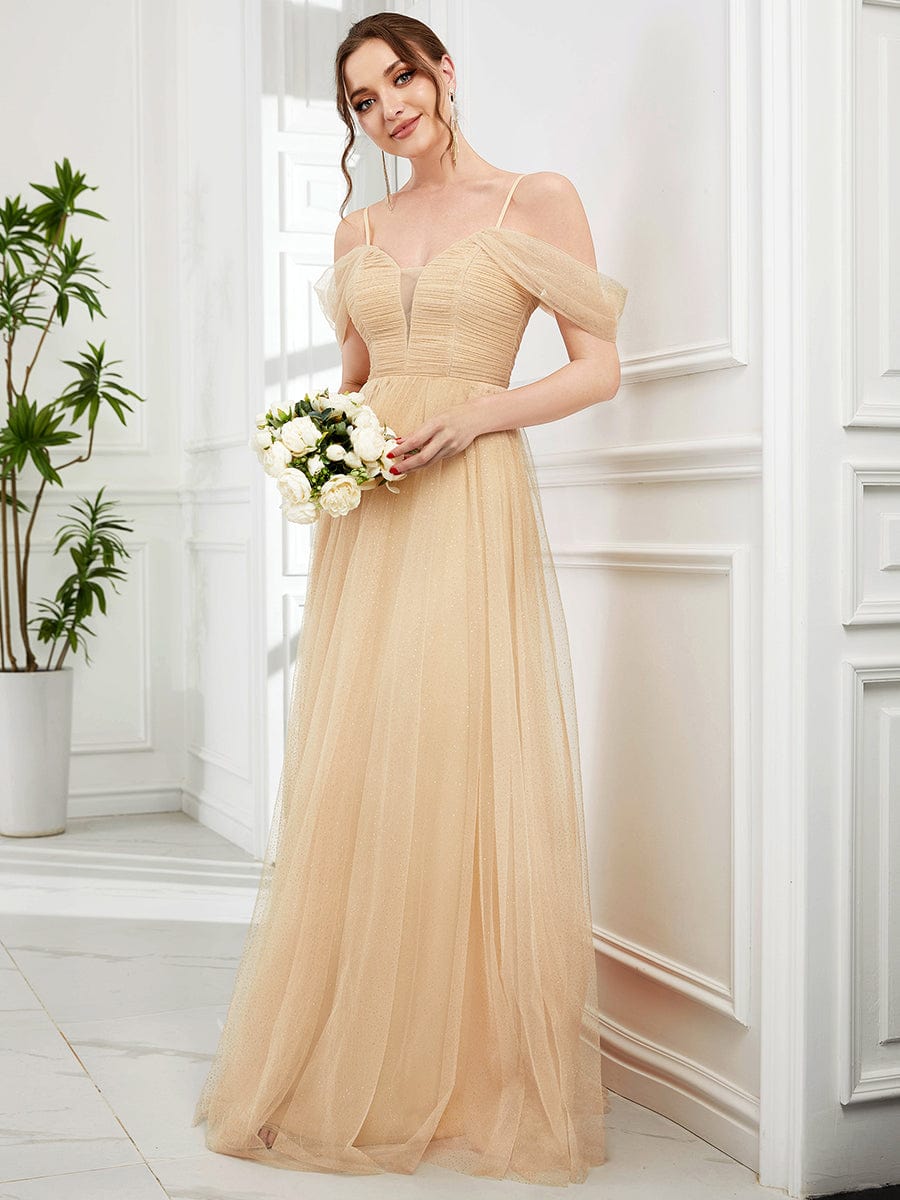 Weitese Cold Shoulder Spaghetti Strap Pleated Sequin Tulle Bridesmaid Dress - Gold / US 2 / UK 6 / EU 32