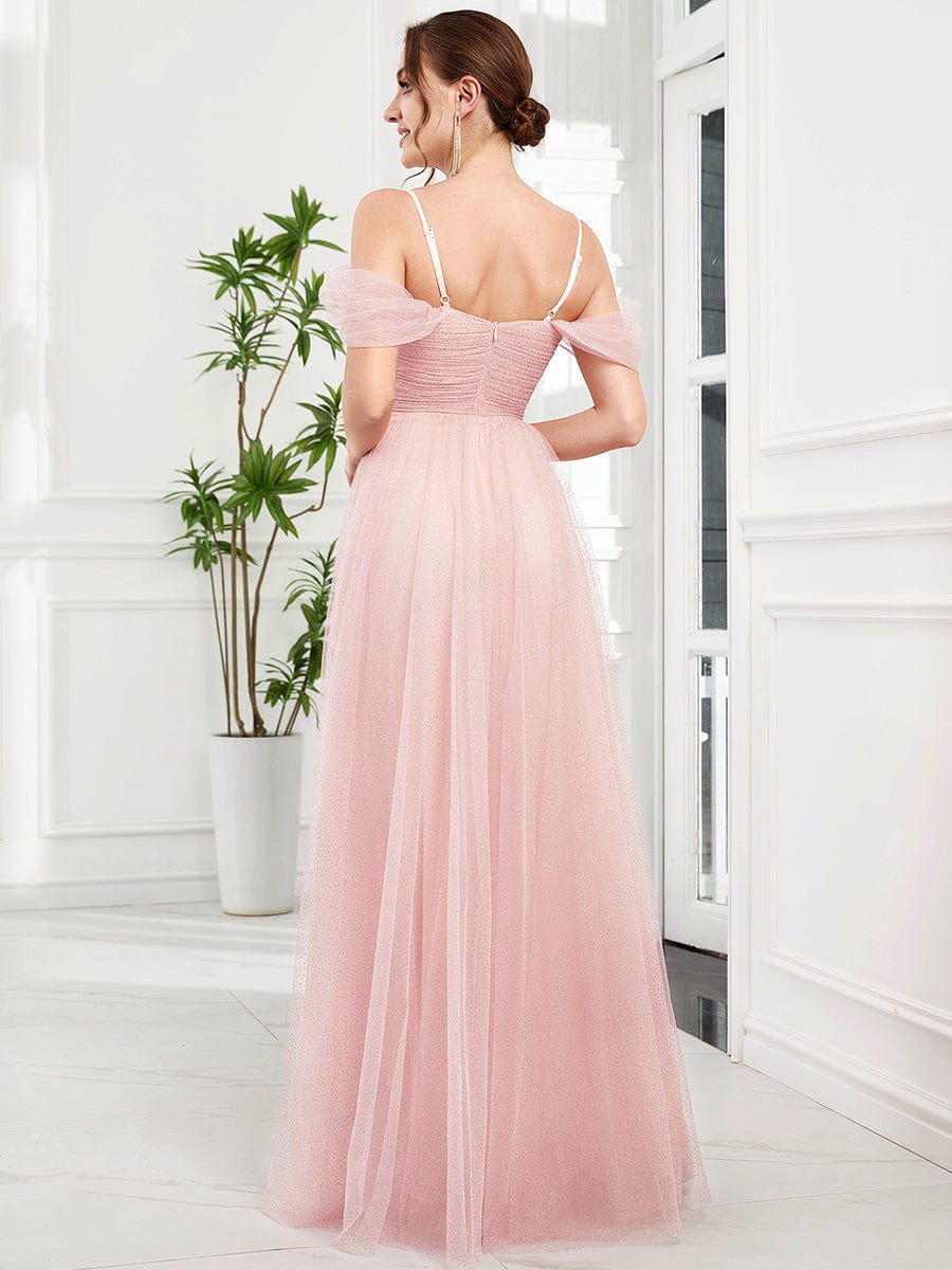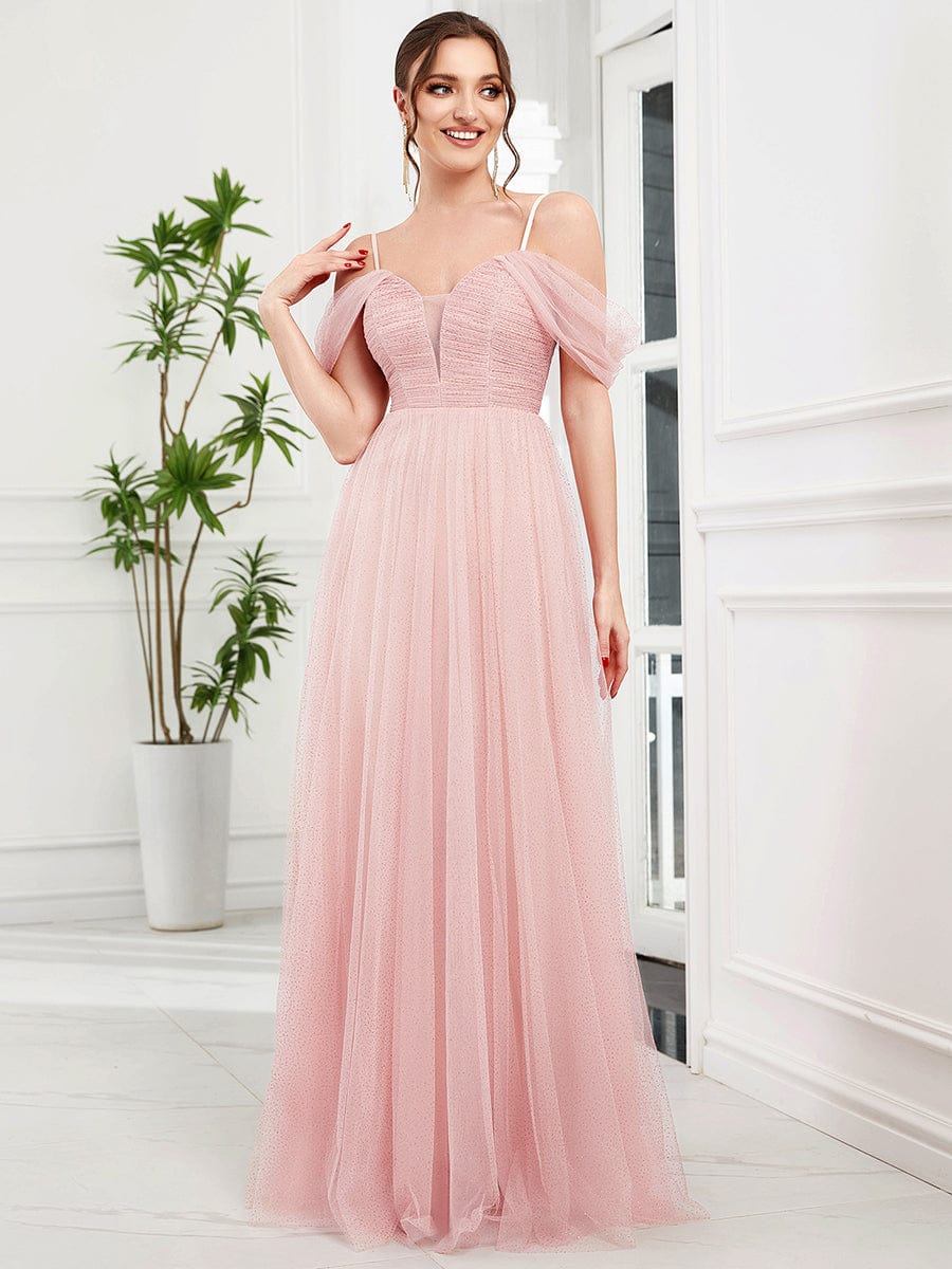 Weitese Cold Shoulder Spaghetti Strap Pleated Sequin Tulle Bridesmaid Dress