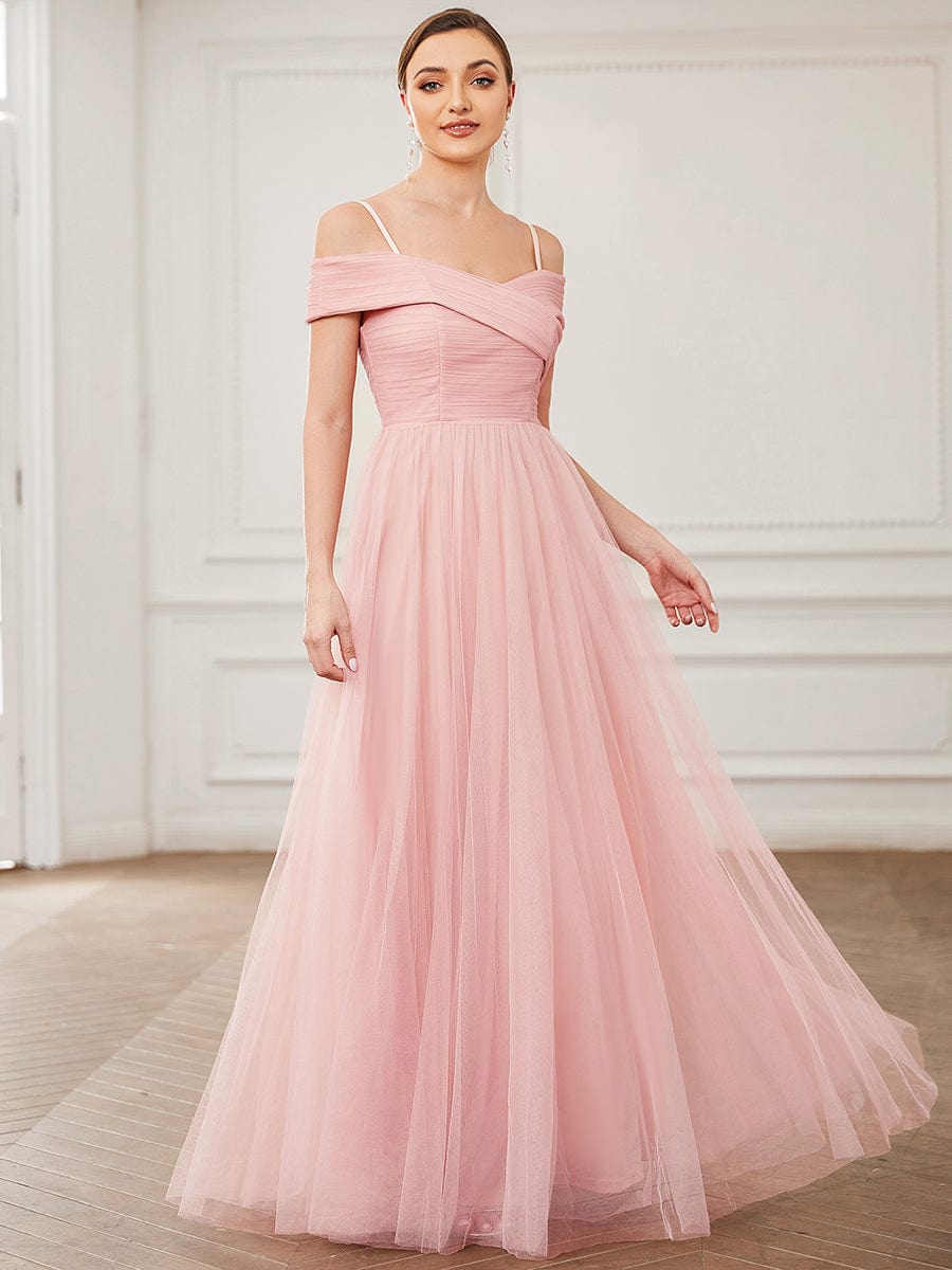 Weitese Spaghetti Strap Cold Shoulder Cross Over A-Line Tulle Bridesmaid Dress