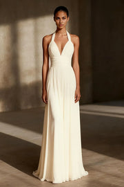 weitese's sleek A-line wedding dress features a modern halter neck, deep V-neckline, and striking cross-back design for subtle allure. The ruched waist flatters your silhouette, while the lightweight flowing skirt and sweep train create an elegant, minimalist look—ideal for contemporary, outdoor, or intimate wedding venues. Crafted with soft, drapey fabric for comfort and timeless, sophisticated style.