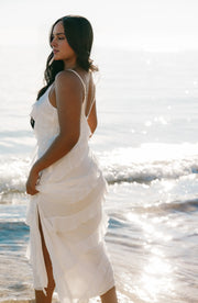 weitese's Elevate your romantic allure with this white chiffon ruffle maxi dress. It features flowing chiffon fabric with asymmetric ruffle detailing for opulent charm, spaghetti straps and an open back for refined elegance, and a figure-hugging silhouette that adds a touch of glamorous flair. The classic white hue ensures a captivating finish, making it perfect for weddings, formal events, or any occasion where you want to embrace timeless luxury with polished, show-stopping style.