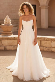weitese's elegant wedding gown features a strapless sweetheart neckline, a tailored fitted bodice, and an A-line chiffon skirt with a flowing train. The open-back design (with corset-style detailing) adds subtle sophistication, while the soft ivory hue suits Mediterranean, garden, or formal weddings. Its lightweight fabric ensures comfort, blending timeless minimalism with graceful movement.