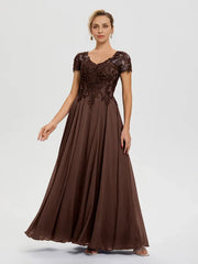 weitese's Elevate your formal style with this chocolate brown lace bodice chiffon maxi dress. It features a sophisticated V-neckline, short sheer sleeves adorned with intricate lace and bead detailing, and a flowing chiffon skirt that offers graceful movement. Crafted from lightweight chiffon and ornate lace, this dress exudes timeless elegance and is perfect for weddings, mother-of-the-bride events, or any upscale occasion. The rich chocolate brown hue and refined design make it a standout choice, ideal for pairing with gold jewelry and strappy heels to complete a polished ensemble.