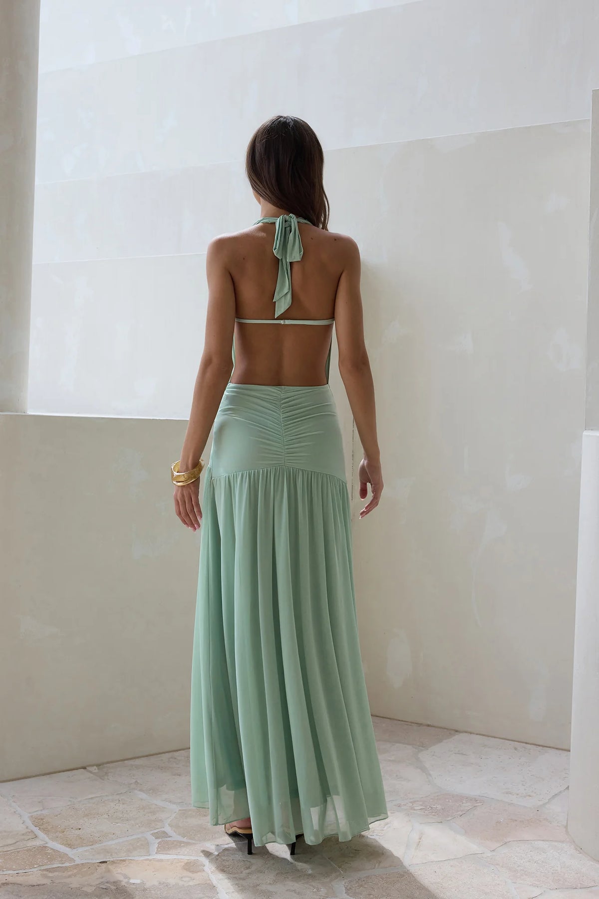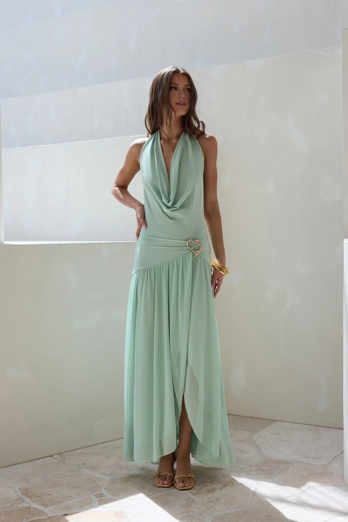 weitese's Elevate your formal look with this mint green halter neck cowl front maxi dress. It features a lightweight fabric for graceful movement, a halter neck design with a dramatic cowl front for elegant allure, and an open back with tie detail for romantic charm. The asymmetrical hem adds dynamic style, making it perfect for evening galas, beach weddings, or any occasion where you want to showcase timeless sophistication with a blend of airy texture and refined detailing.