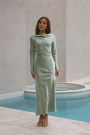 weitese's Elevate your formal look with this sage green satin long-sleeve maxi dress. It features a satin fabric for luxurious shine, a cowl neck design for elegant allure, and long sleeves for refined charm. The lace-up back detail adds a touch of modern style, while the flowing silhouette offers graceful movement. Perfect for evening galas, weddings, or any occasion where you want to showcase timeless sophistication with a blend of glamorous satin and subtle detailing.