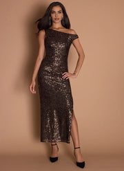 weitese's Elevate your glamorous look with this bronze sequin one-shoulder midi dress. It features all-over sequin detailing for opulent allure, a one-shoulder neckline for refined charm, and a high slit for sophisticated flair. The shimmering bronze hue ensures a standout finish, making it perfect for formal events, evening galas, or any occasion where you want to blend bold sparkle with modern, tailored design.