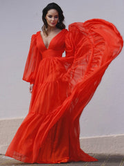 A-Line/Princess V-neck Long Sleeves 30D Chiffon Ruffles Sweep/Brush Train Dresses