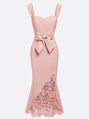 weitese's Elevate your romantic look with this blush pink mermaid midi dress. It features a structured bodice with unique shoulder straps for tailored allure, a statement bow waist detail for feminine charm, and a lace side slit with mermaid silhouette for sophisticated flair. The combination of smooth fabric and delicate lace ensures a polished finish, making it perfect for formal events, weddings, or any occasion where you want to blend soft color with playful design elements.