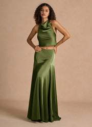 weitese's Elevate your modern look with this olive green satin two-piece maxi dress. It features lustrous satin fabric for opulent allure, a cowl neck crop top with open back for refined charm, and a mermaid silhouette skirt for sophisticated flair. The rich olive green hue ensures a standout finish, making it perfect for formal events, evening galas, or any occasion where you want to blend bold elegance with contemporary, two-piece design.