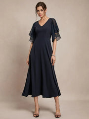 weitese's Elevate your elegant look with this navy blue chiffon midi dress. It features a V-neckline for classic allure, ruffled flutter sleeves for refined charm, and an A-line silhouette for polished flair. The flowing chiffon fabric ensures a graceful finish, making it perfect for formal events, bridesmaid duties, or any occasion where you want to blend rich color with timeless design.