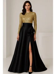 Sparkle Ball Gown Long Sleeve Crew Neck Sequins Bow Floor-Length Evening Dress