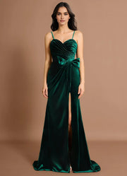 weitese's Elevate your luxurious look with this emerald green velvet sweetheart neck maxi dress. It features plush velvet fabric for opulent allure, a sweetheart neckline with thin straps and oversized bow detail for refined charm, and a high slit with mermaid silhouette for sophisticated flair. The rich emerald green hue ensures a standout finish, making it perfect for formal events, winter galas, or any occasion where you want to blend classic elegance with dramatic, textural design.
