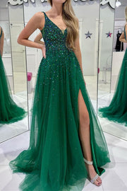 Weitese Bling A Line V Neck Dark Green Long Prom Dress with Beading