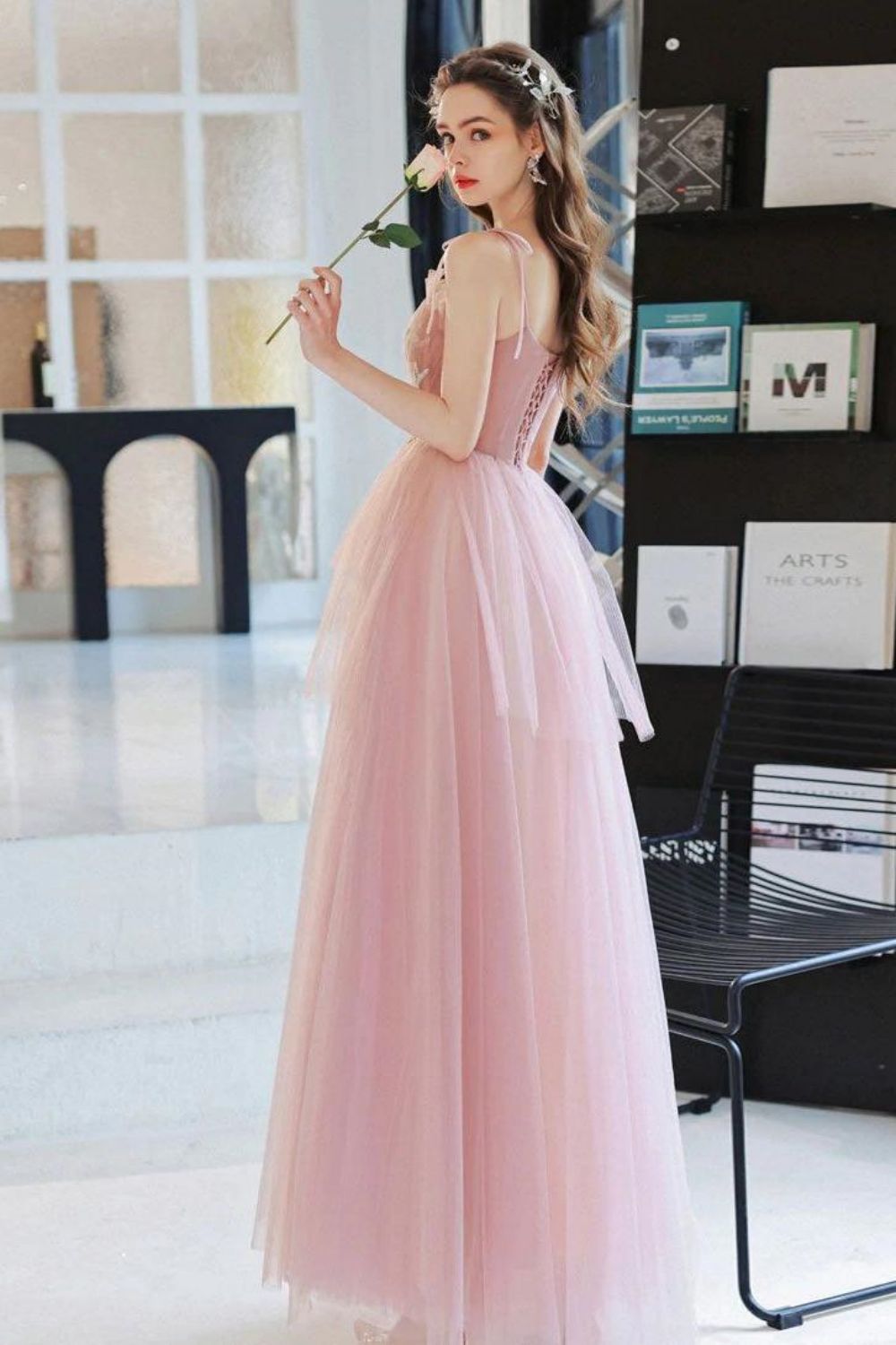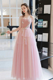 Weitese Elegant A Line Spaghetti Straps Pink Long Prom Dress with Appliques
