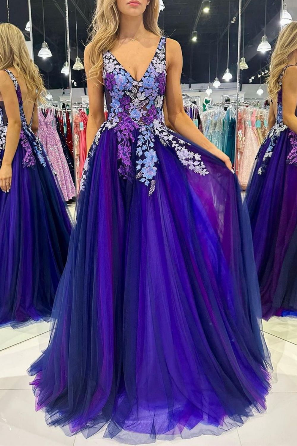 Weitese Gorgeous A Line V Neck Purple Tulle Long Prom Dress with Appliques - US 2 / UK 6 / EU 32