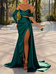 Weitese Mermaid Evening Dress Red Green Dress Emerald Green Satin Gown Ruched Wedding Party Formal Floor Length WIth Long Sleeve Off Shoulder Slit - US 2 / UK 6 / EU 32