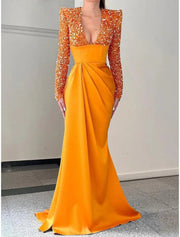 Weitese Mermaid / Trumpet Evening Gown Elegant Dress Formal Sweep / Brush Train Long Sleeve V Neck Satin with Pleats Sequin - Orange / US 2 / UK 6 / EU 32
