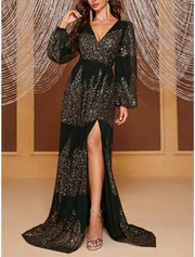 Weitese Sheath / Column Evening Gown Elegant Dress Formal Sweep / Brush Train Long Sleeve V Neck Polyester with Pleats Sequin Slit - US 2 / UK 6 / EU 32