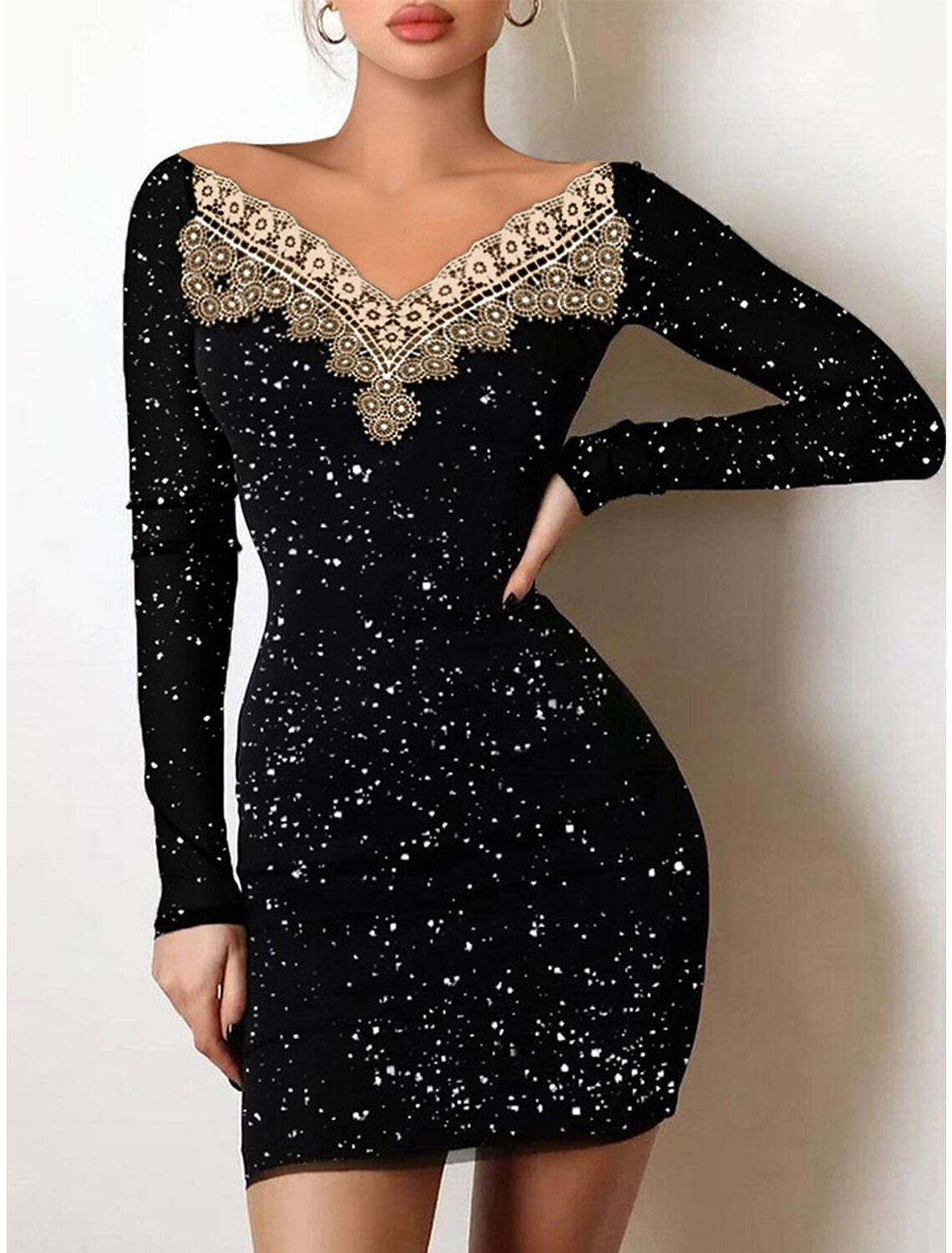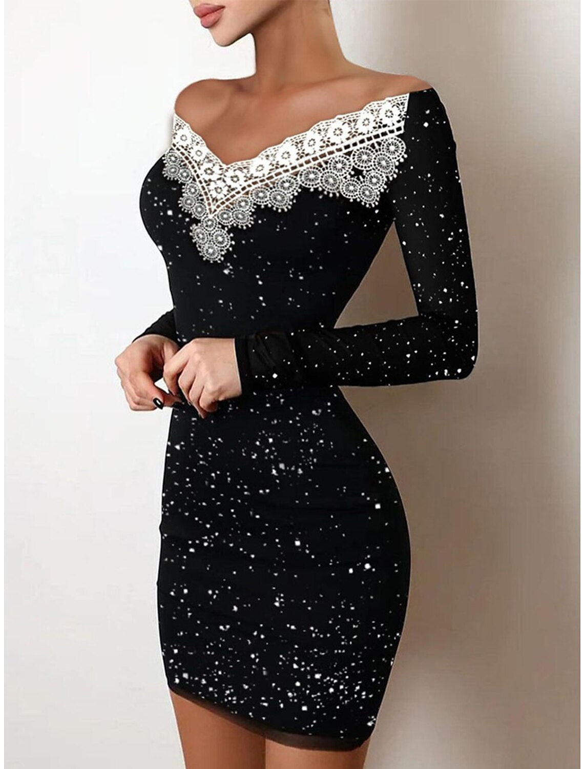 Weitese Women's Black Dress Party Dress Wedding Guest Dress Mini Dress Black Khaki Long Sleeve Dot Lace Spring Fall Winter V Neck Fashion Winter Dress Wedding Guest Evening Party - Black / US 2 / UK 6 / EU 32