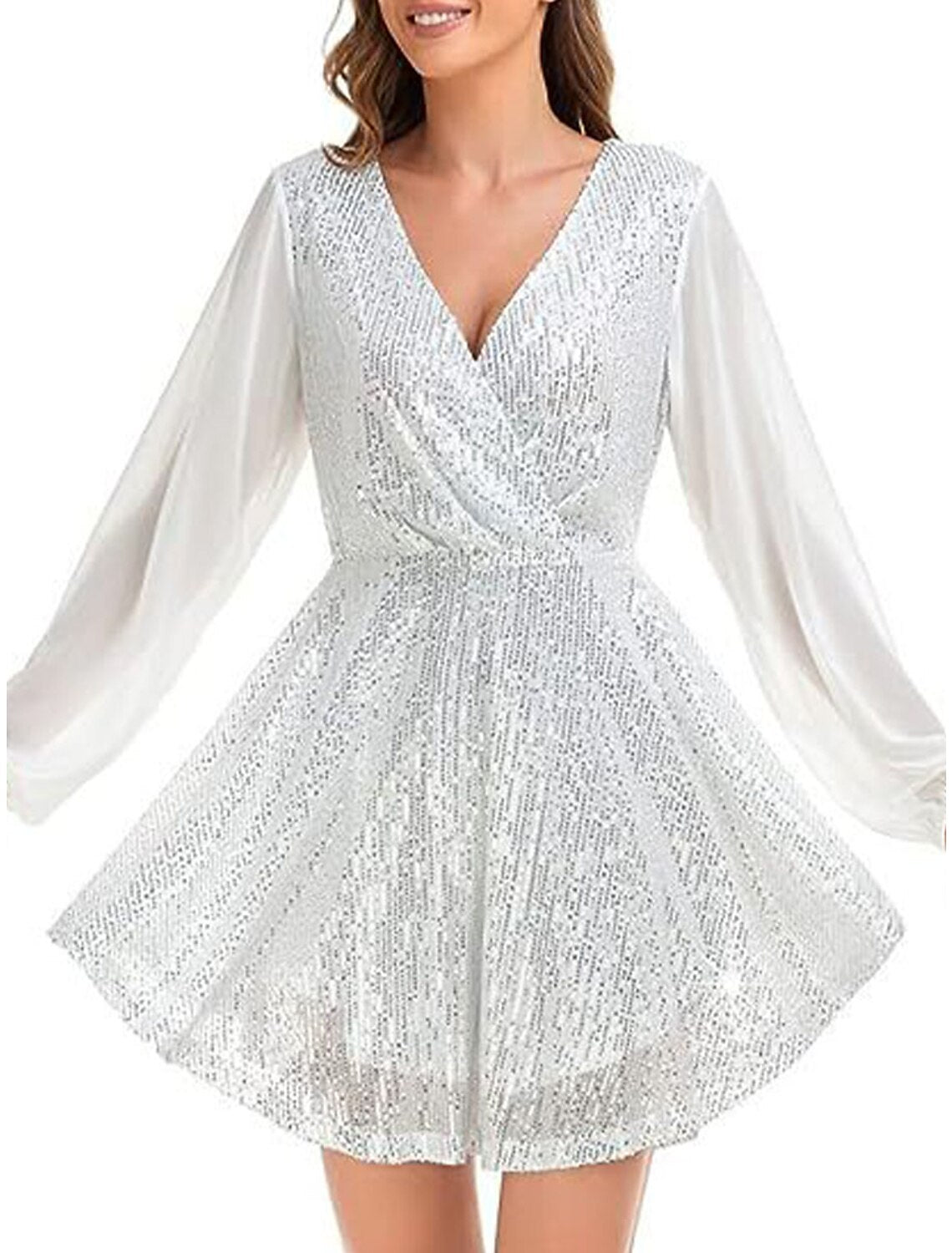 Weitese Women's Black Dress Sequin Dress Party Dress Mini Dress Black White Long Sleeve Pure Color Sequins Spring Fall Winter V Neck Fashion Winter Dress Wedding Guest Evening Party