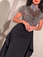 Weitese Women's Black Sequin Dress Prom Dress Party Dress Sparkly Dress Long Dress Maxi Dress Black Short Sleeve Color Block Summer Spring Fall Turtleneck Fashion Evening - US 2 / UK 6 / EU 32