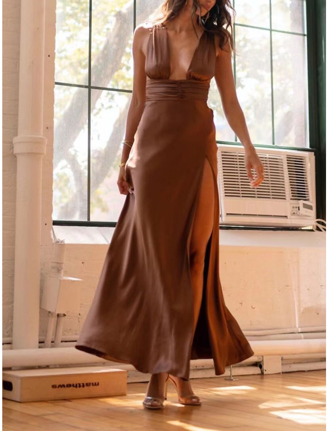 Weitese Women's Prom Dress Party Dress Wedding Guest Dress Long Dress Maxi Dress Rose Gold Black White Sleeveless Plain Split Summer Spring Fall Deep V Elegant Wedding Guest Evening Party Vacation - Brown / US 2 / UK 6 / EU 32