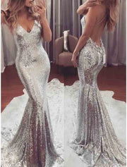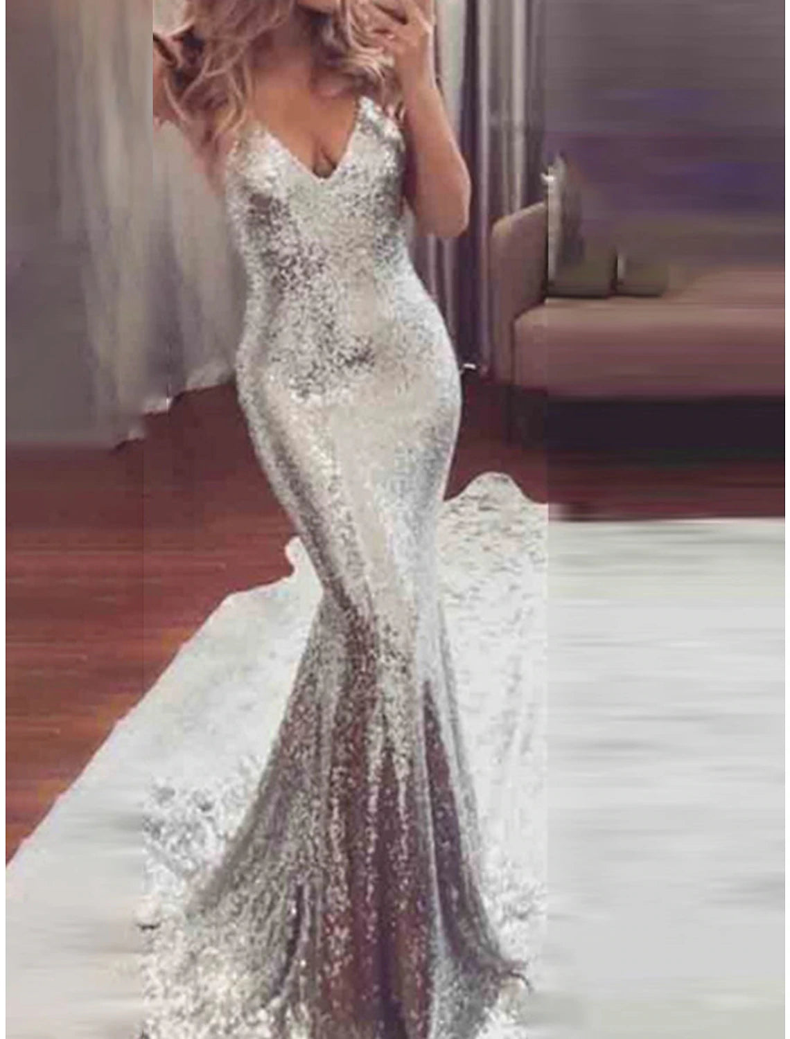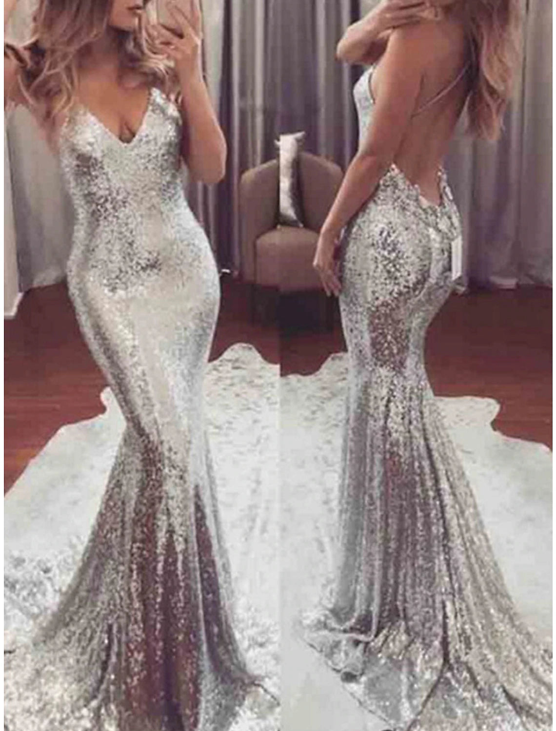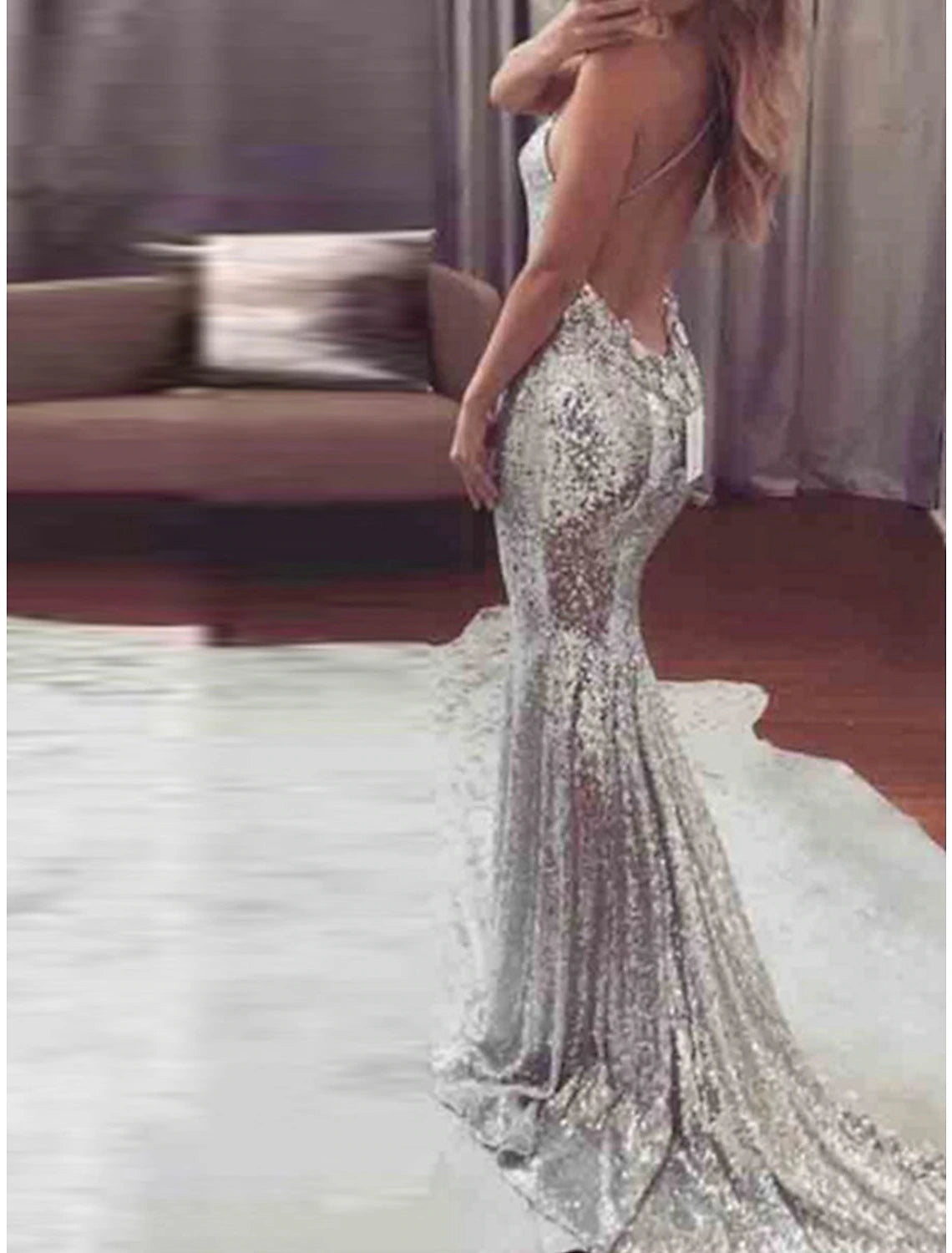 Weitese Women's Silver Sequin Dress Prom Dress Party Dress Sparkly Dress Long Dress Maxi Dress Silver Sleeveless Spring Fall Winter Spaghetti Strap Fashion Evening Party - US 2 / UK 6 / EU 32