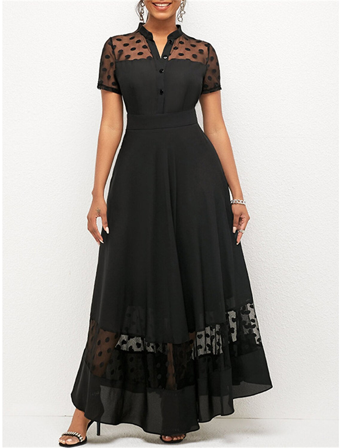 Women's Prom Dress Party Dress Cocktail Dress Long Dress Maxi Dress Black Wine Short Sleeve Polka Dot Ruched Spring Fall Winter V Neck Fashion Winter Dress Wedding Guest Birthday - Black / US 2 / UK 6 / EU 32
