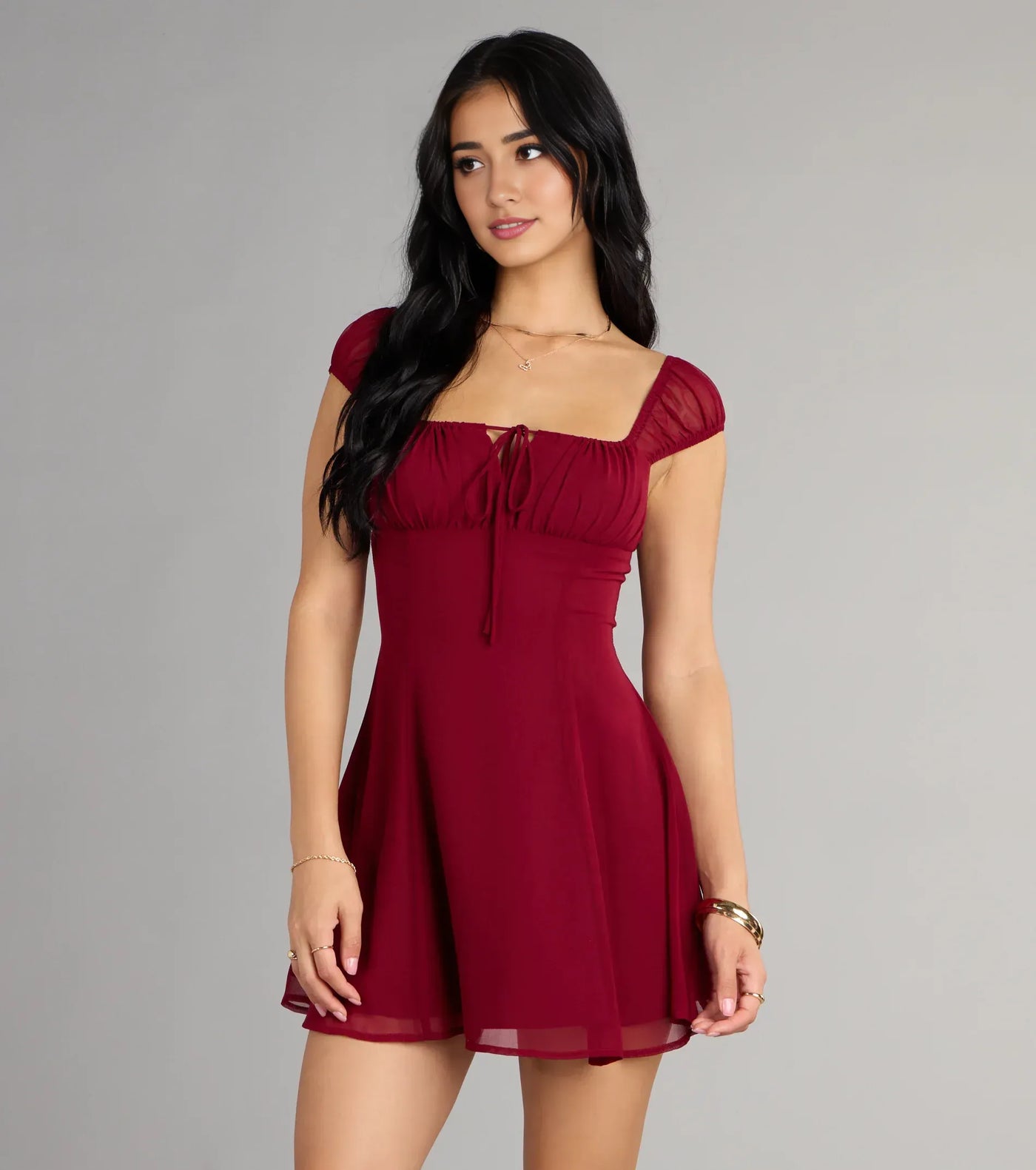 weitese's Elevate your romantic and playful style with this burgundy chiffon square neck mini dress. It features lightweight chiffon fabric with a square neckline and tie front detail for sweet allure, cap sleeves for delicate coverage, and a flared skirt for dynamic movement. The dress is perfect for date nights, garden parties, or any occasion where you want to embrace feminine charm with a touch of vintage-inspired elegance.