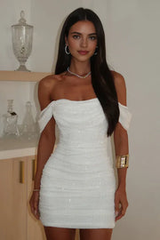 weitese's white sequin mini dress features an off-shoulder ruffled neckline, an all-over ruched body-con silhouette, and a full-open back (with zipper detail). The shimmering sequin texture and crisp white tone balance modern glamour with sophisticated elegance, making it ideal for upscale cocktail parties, formal dinner events, or evening receptions—combines sleek tailoring with eye-catching, polished allure.