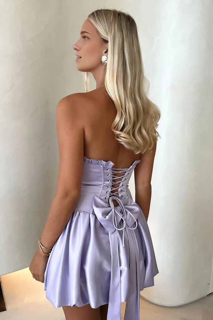 weitese's satin mini dress features a strapless neckline, a corset-style bodice (with lace-up back and bow detail), and a voluminous ruffled skirt. The lustrous fabric and soft pastel tone balance retro-inspired elegance with playful charm, making it ideal for spring cocktail parties, birthday celebrations, or upscale daytime gatherings—combines gentle color with refined, whimsical design.