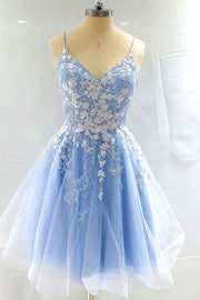 Weitese Dress V Neck Light Blue Appliques A-line Short Dress Sleeveless Knee Length Homecoming Dress