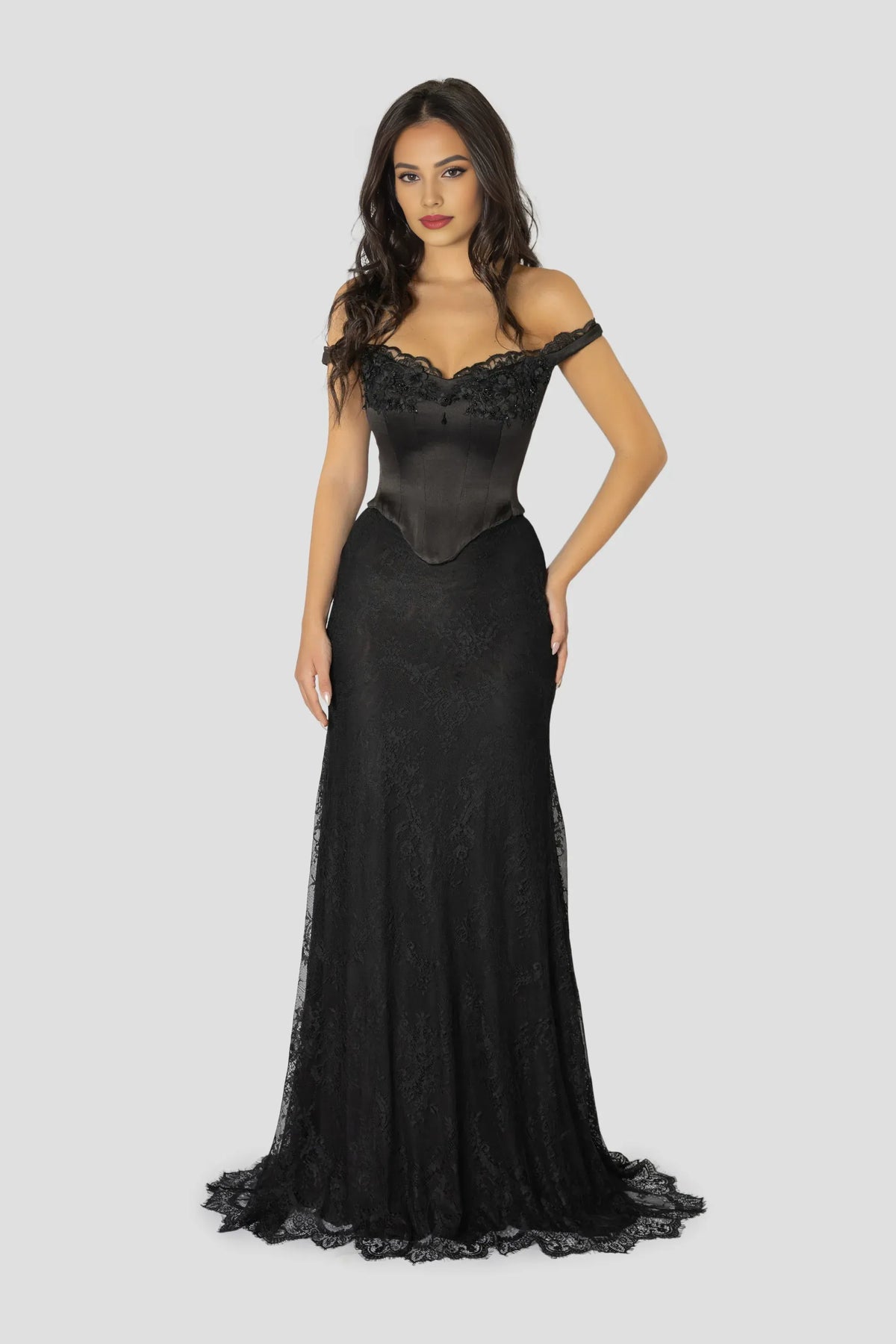weitese's gothic-inspired black gown features an off-shoulder neckline, a corset-lace back, a structured satin bodice (trimmed with delicate lace), and a form-fitting lace mermaid skirt (with a subtle train). The dark palette and tailored design balance edge with elegance—ideal for gothic-themed events, formal alternative gatherings, or evening galas. Its figure-hugging silhouette and luxurious texture create a dramatic, alluring look.