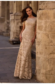 weitese's Elevate your timeless allure with this champagne lace off-shoulder maxi dress. It features intricate floral lace detailing throughout for opulent charm, an off-shoulder neckline with short sleeves that exude classic elegance, and a mermaid silhouette that ensures a figure-flattering fit. The soft champagne hue and refined construction make it perfect for formal events, weddings, or any occasion where you want to embrace sophisticated, show-stopping glamour.