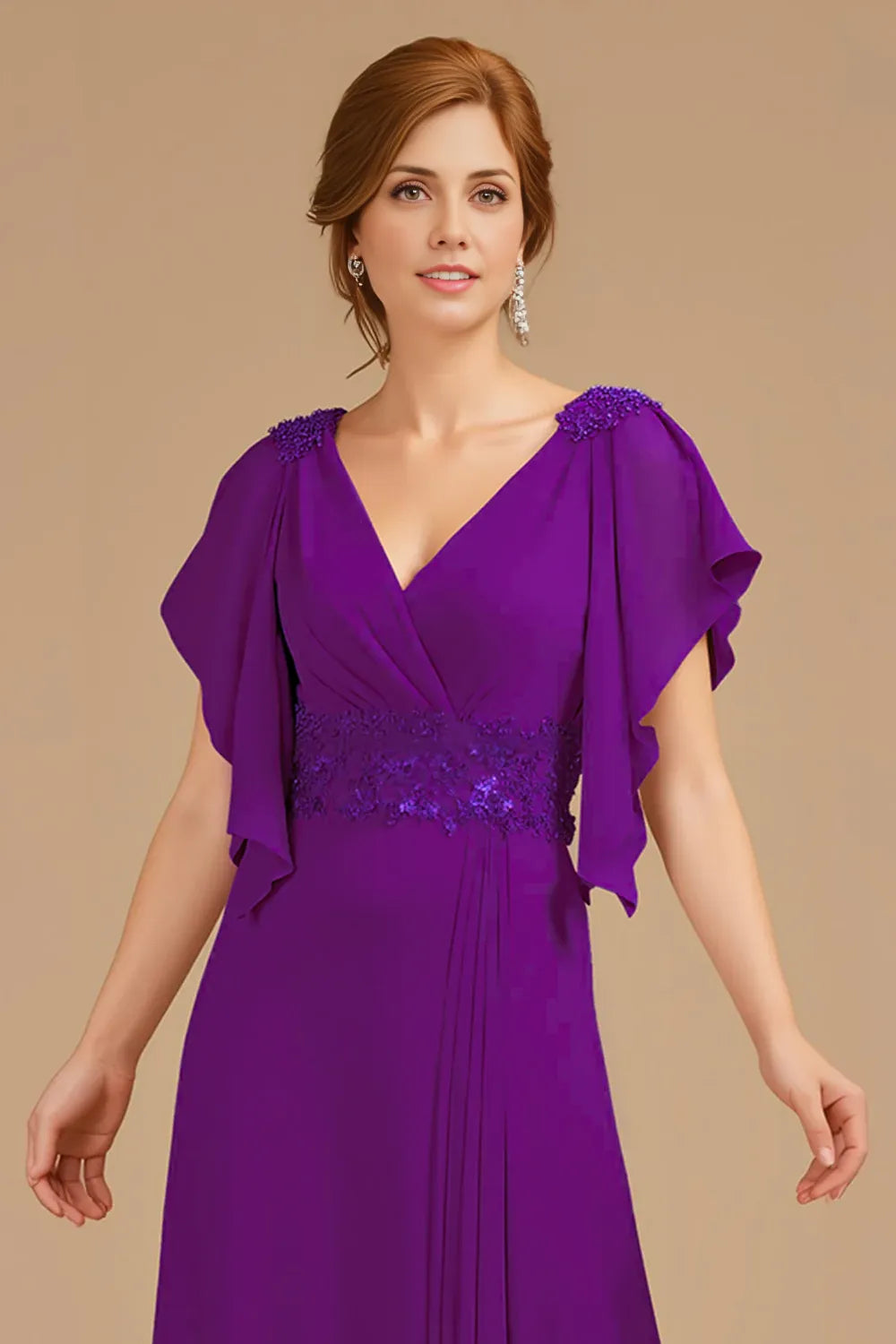 Chic A Line V-Neck Flutter Sleeve Zipper Up Floor-Length Mother of the Bride Dress - Purple / US 2 / UK 6 / EU 32